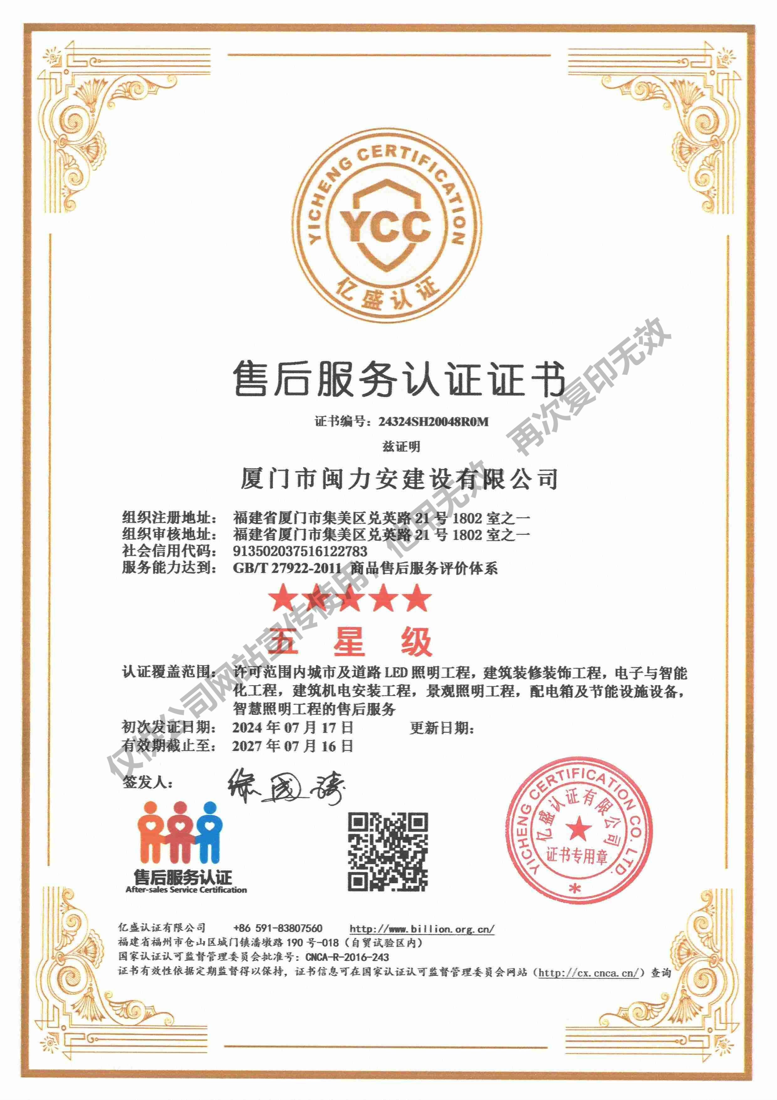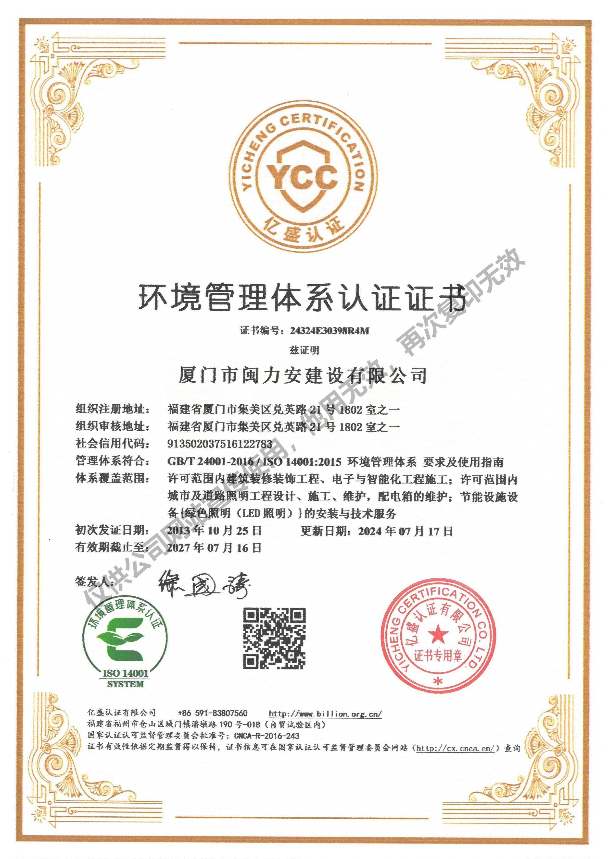 廈門市閩力安建設(shè)有限公司成立于2003年,公司取得市政公用工程施工總承包貳級、建筑裝修裝飾工程專業(yè)承包壹級、城市及道路照明工程專業(yè)承包壹級、電子與智能化工程專業(yè)承包貳級、消防設(shè)施工程專業(yè)承包貳級、電力工程施工總承包叁級、建筑機電安裝工程專業(yè)承包叁級、輸變電工程專業(yè)承包叁級、環(huán)保工程專業(yè)承包叁級、照明工程設(shè)計專項甲級、建筑裝飾工程設(shè)計乙級、施工勞務(wù)等資質(zhì)的綜合型企業(yè),公司于2013年通過了ISO9001質(zhì)量體系認(rèn)證,ISO14001環(huán)境管理體系認(rèn)證,OHSAS18001職業(yè)健康安全管理體系認(rèn)證。